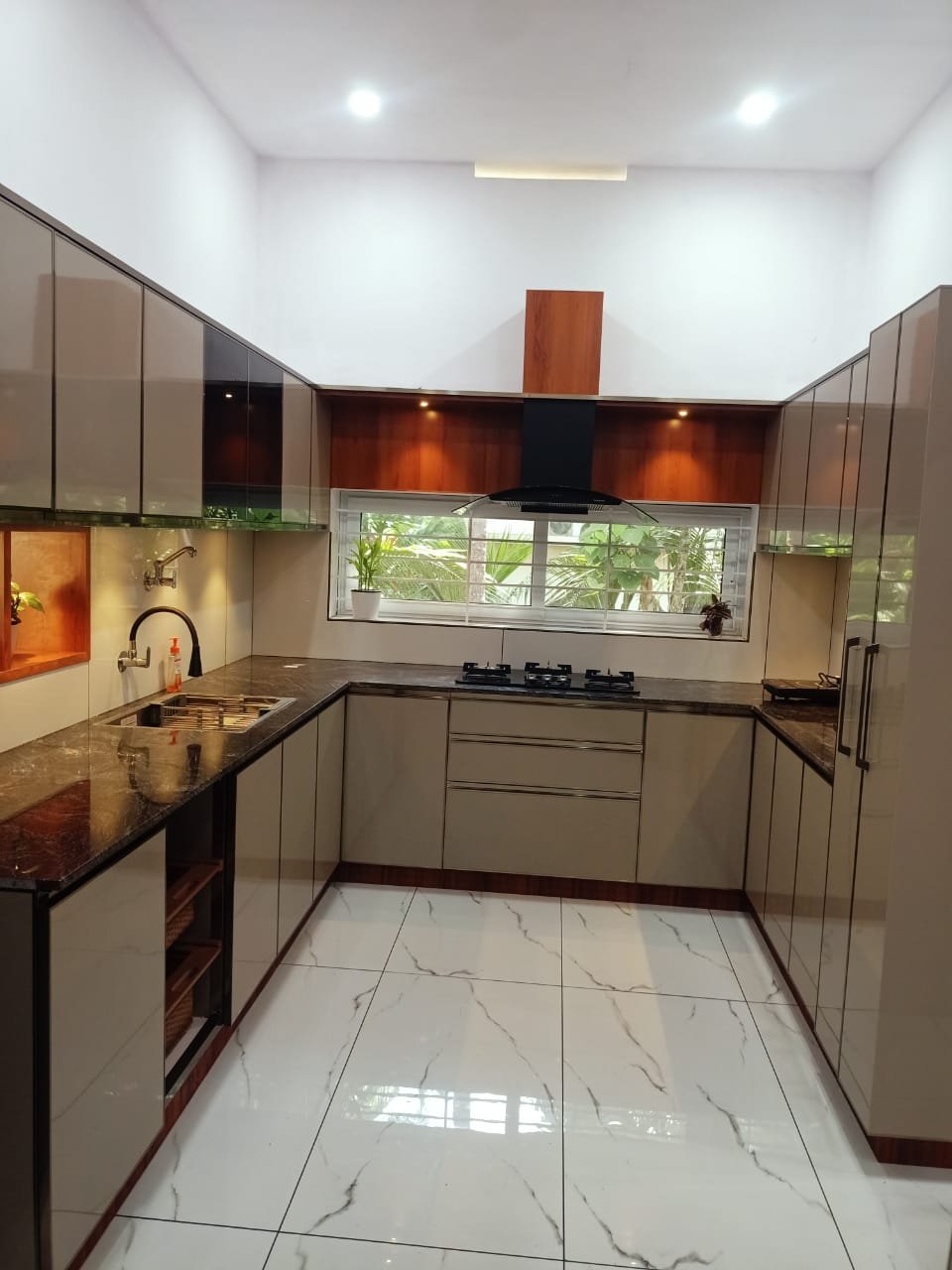 The modular kitchen has plenty of storage space, and the adjacent work area makes daily tasks easier.