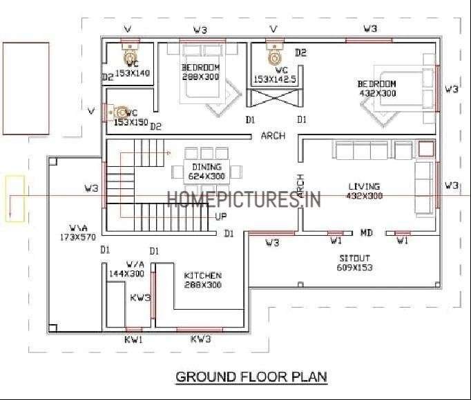 The perfect fusion of red, grey with the decorated pillars contribute a classy touch to the entire frontal area. In this plan have used geometrical elements and simple design of architectural style to get a unique look. This house is single storey one. From the sit out we enter the living and dining area. The kitchen is minimalist in design. The elegant storage space are its highlight. The work area has ample space for washing and ironing cloths. There are 2 bedrooms with attached bathrooms, wardrobes and study area. Has the elevation of this modern house piqued your interest ? Then don’t hesitate from getting in touch with the architect for more information on the cost and plan.