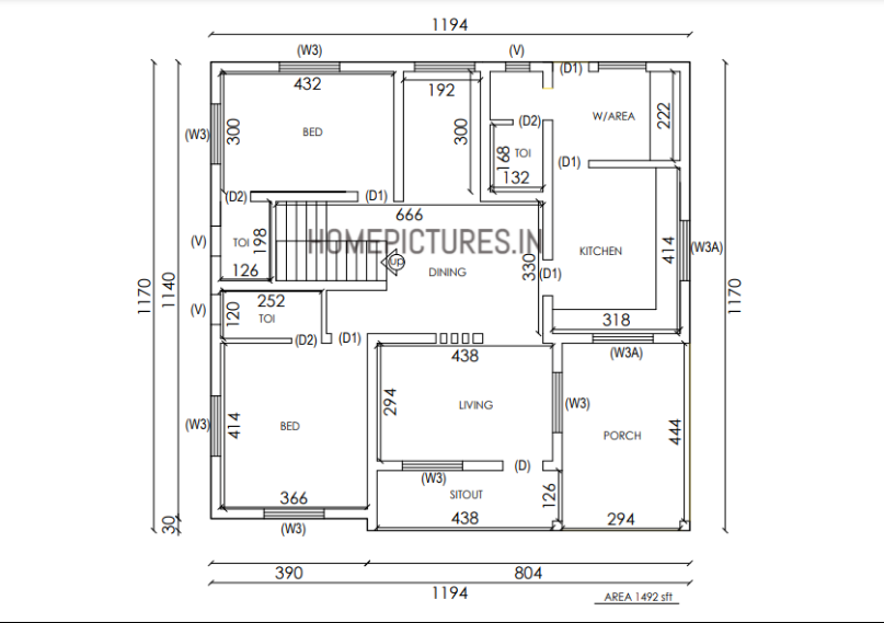 The house is well packed with a sit out, car porch, living room, dining area, prayer room, kitchen, work area, wash area, stair room, common toilet and 2 bedroom with attached bathrooms. Every nook has been optimally utilized and this, precisely is the highlight of the house. White color theme dominates both interiors and exteriors of the house. The perfect fusion of white and grey with the decorated pillars contribute a classy touch to the entire frontal area. In this plan have used geometrical elements and simple design of architectural style to get a unique look.