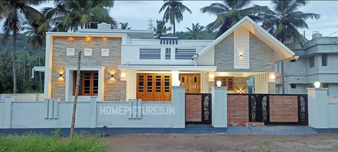 Here comes an absolutely awesome Kerala house design which is at an area of 1619 square feet. This house has simple elevation, and stone cladding in grey color on the pillar and wall above the car porch adds a perfect contrast to it. This is budget contemporary style design. The beautifully done landscaping enhances the splendid charm of the house. A spectacle of luxurious sights and stunning decor are unraveled as soon as one enters the house. The creative design of this house looks unique in the mixed roof theme.