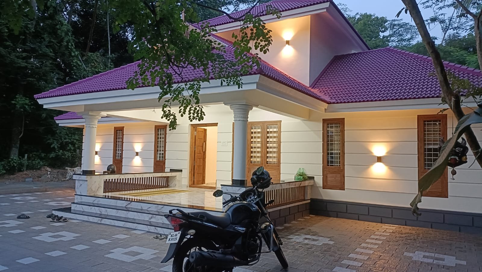 A single storey Kerala house can’t get any better than this. It has an unusual blend of modern and traditional architecture. The top part of the flat roof is nearly invisible, ye the wall connecting to the roof has a charming border to outline the house. All the windows have shades from the outside. While they block out the direct rays of the sun, they match the roof pretty well. Pillars and some portion of the external wall covered with a granite like design that makes it blend in perfectly with the rest of the house.