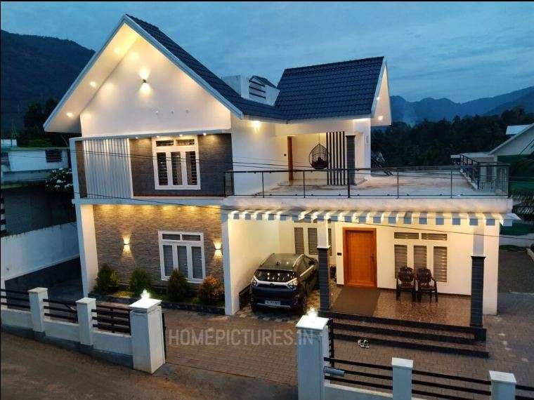 Grand and imposing by day, the colonial house is a stunner by night when the lights come on and emit a golden glow. The view from the balcony is a relaxing experience. A party space on the terrace is a convenient piece of design. The grey-white exterior has been done with late-rite in the column-beam style. There is a car porch, sit out, living room, dining hall, study area, open kitchen, work area, upper living area, balcony and 4 bedroom with attached bathroom in this aesthetically appealing 2383 square feet mansion.