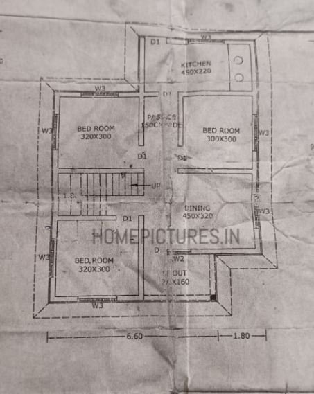 A beautiful house on a low budget. The 880 square feet house has 2 bedrooms an one attached and one common bathroom for domestics. The small sit out with wall cladding’s is a striking feature of the elevation. Other traditional attraction is the late-rite stone walls. The main entrance has been paved with inter-locking tiles. A mix of ultra modern and traditional, this 880 square feet house in Areekodu, Malappuram.