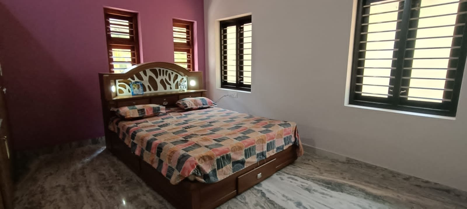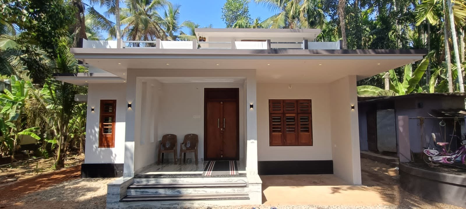 Shaiju and his wife Anusha wanted to build a simple and budget-friendly house in Malappuram. However,they chose this simple, flat style elevation as it is easier to maintain. This house has a sit-out, a living area, two bedrooms, and a kitchen with a work area. The entrance door opens to minimally furnished interiors. The flooring is done using grey-white design marble. The bedrooms are simple and have all the facilities.