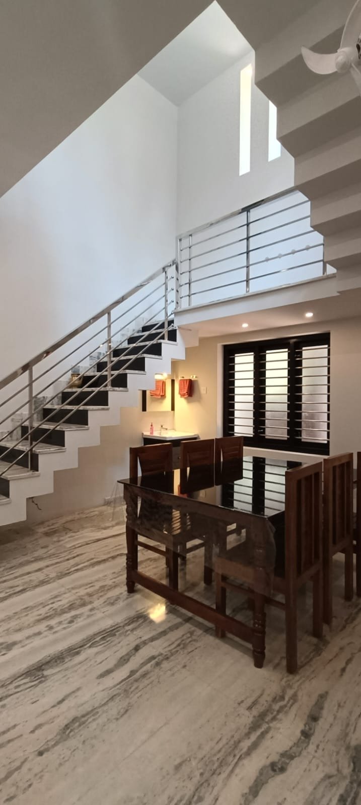 Meanwhile,the C-shaped stair case has steel handrails. The main kitchen is given an amazing combination of grey and white. The cabinets here have been fabricated in aluminum with ACP sheet.The counter top,meanwhile, has been paved with black colour granite. There is a work area right next to the main kitchen. Working within a budget encourages creativity and resourcefulness.